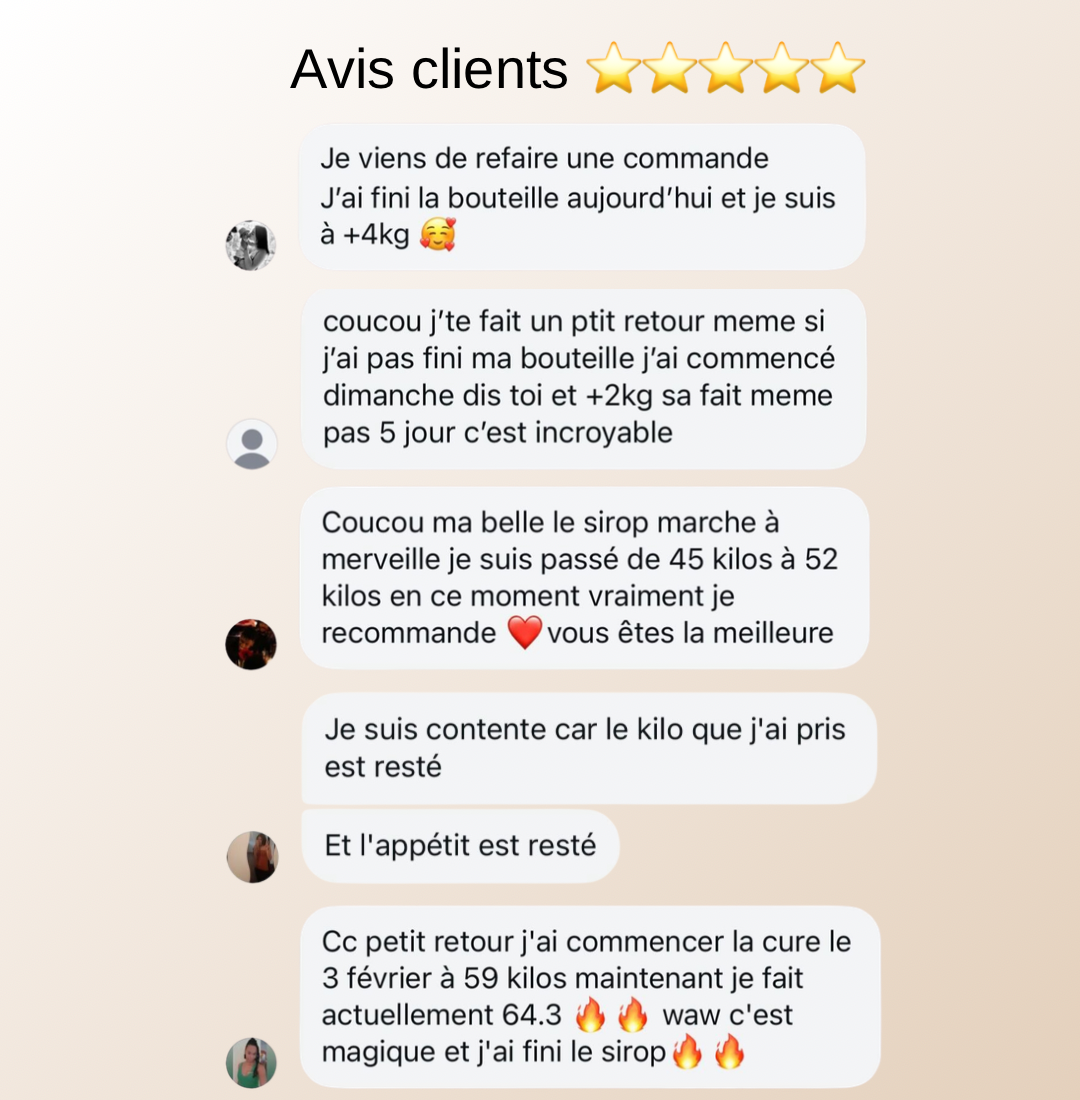 Le sirop favorise une prise de poids globale, mais ses effets peuvent varier en fonction de ton métabolisme. Par exemple, si tu as tendance à prendre du poids principalement au niveau des cuisses, alors le sirop amplifie ce résultat de manière similaire.