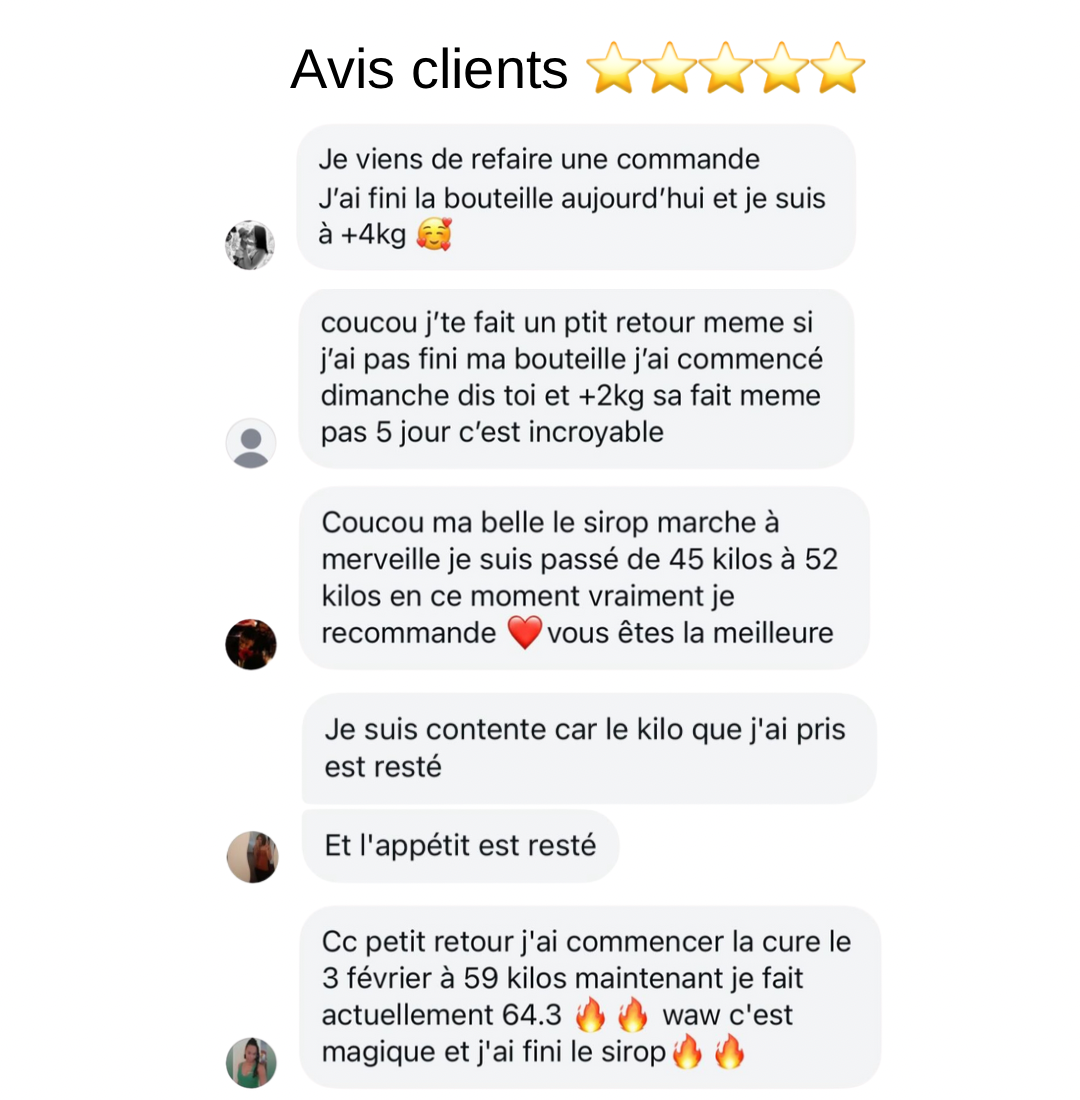 Voici les progrès d'une cliente après l'utilisation du sirop clé appétit.